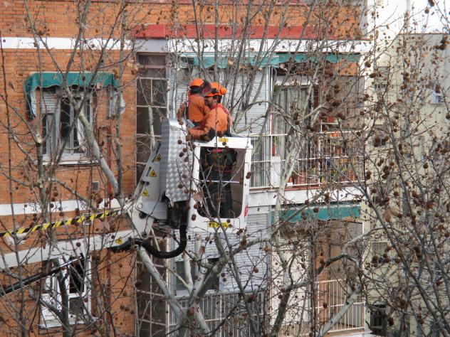 Carabanchel: jardineros podando en cesta elevadora,