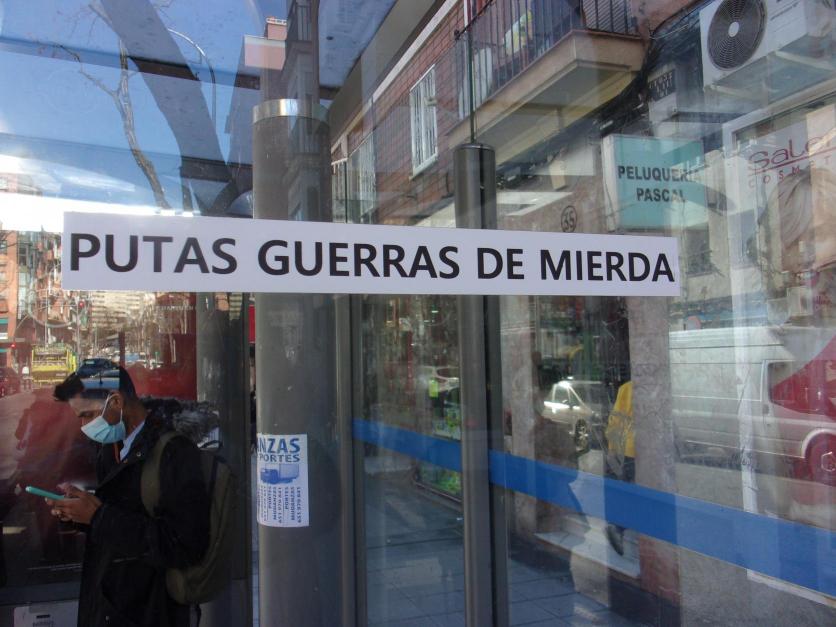 Pegatina con mensaje pacifista en una parada de autobús,