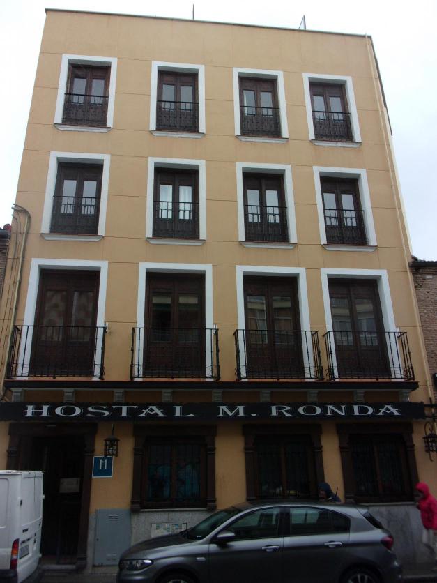 Edificio del hostal M. Ronda con cartel de completo,