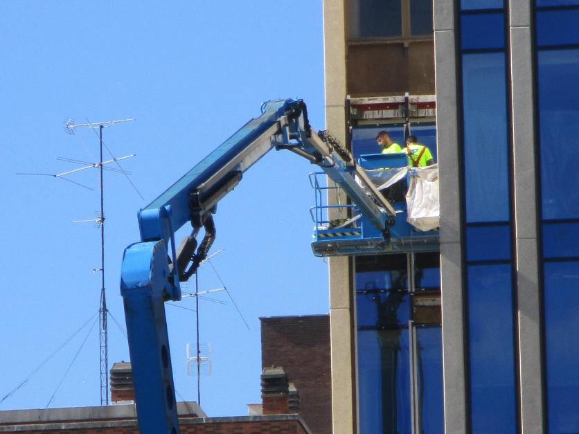 Grúa elevadora con operarios limpiando los cristales de un edificio en Chamartín,