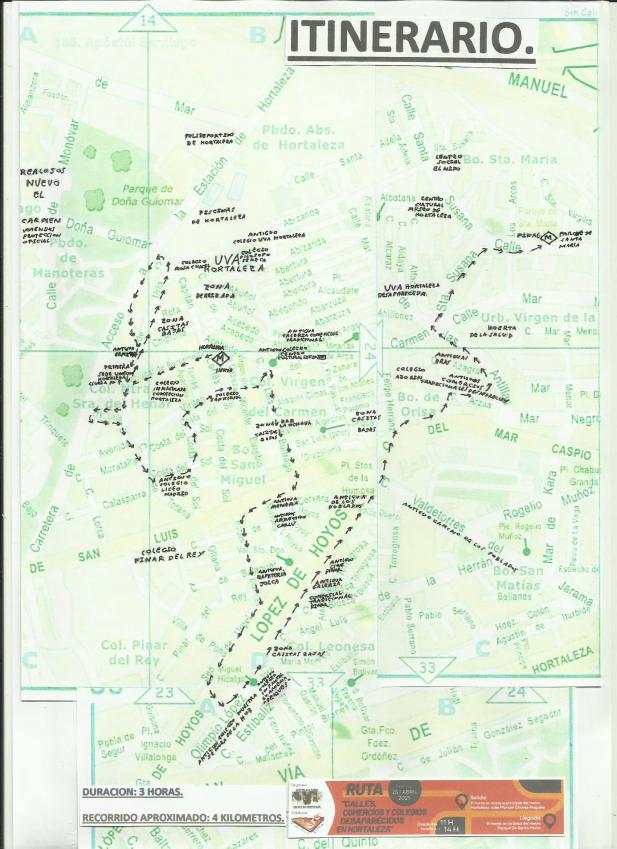 itinenario de la ruta de calles, comercios y colegios desaparecidos sobre plano de la zona,