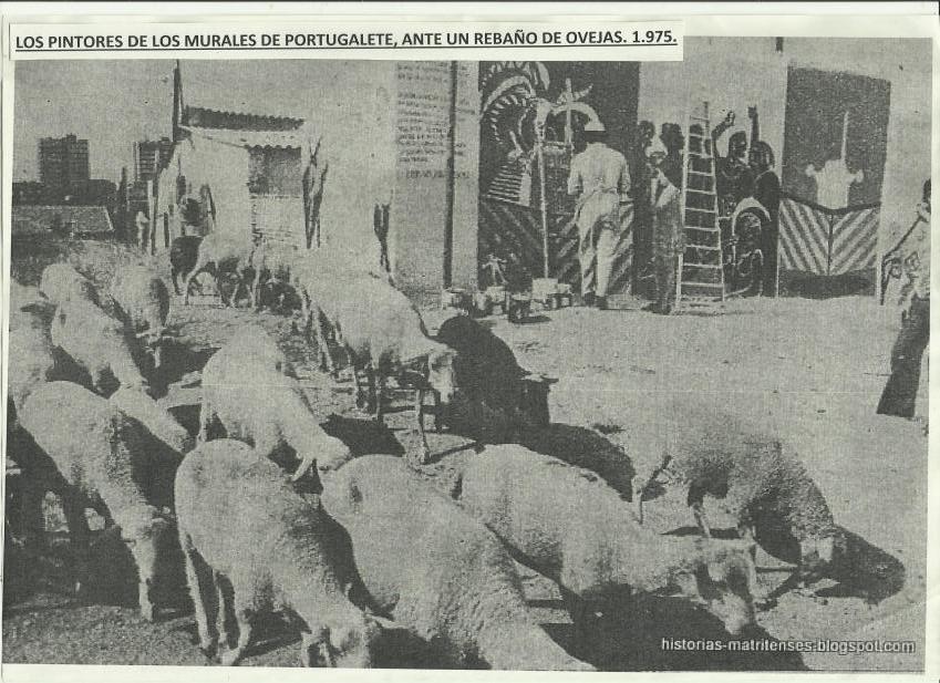 los pintores de los murales de portugalete ante un rebaño de obejas. 1.975,