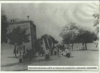 vista del palacio de buenavista con una procesion religiosa. posguerra,