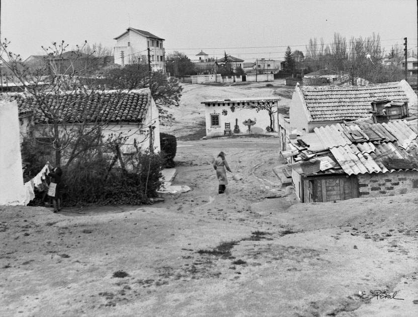 portugalete, canillas. casitas y calles sin asfaltar con murales de los artistas en protesta. 1.975,