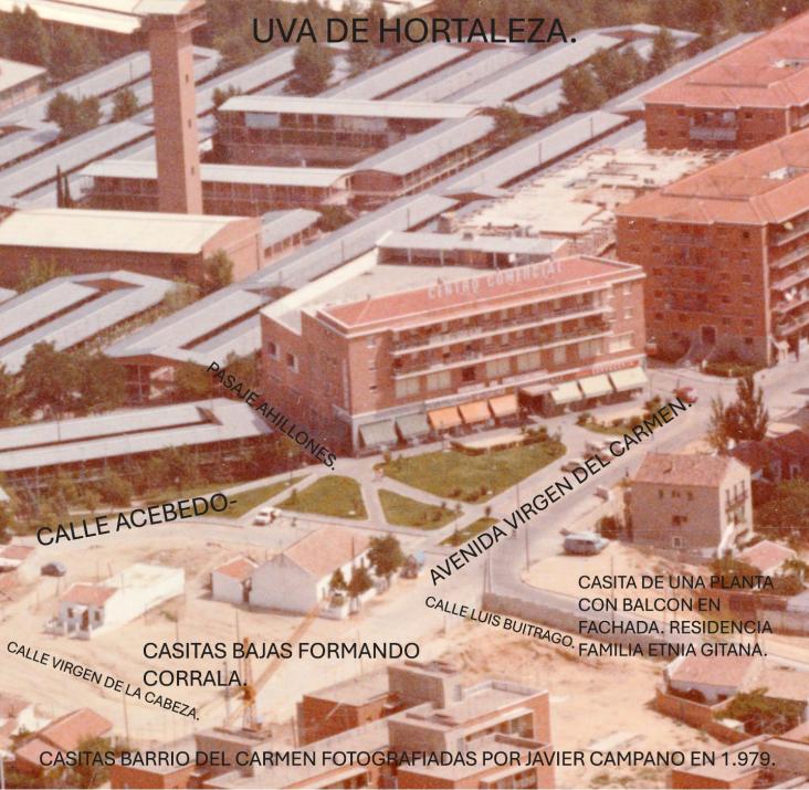toma aerea de la zona del barrio del carmen en verano de 1.973 con calles desaparecidas,