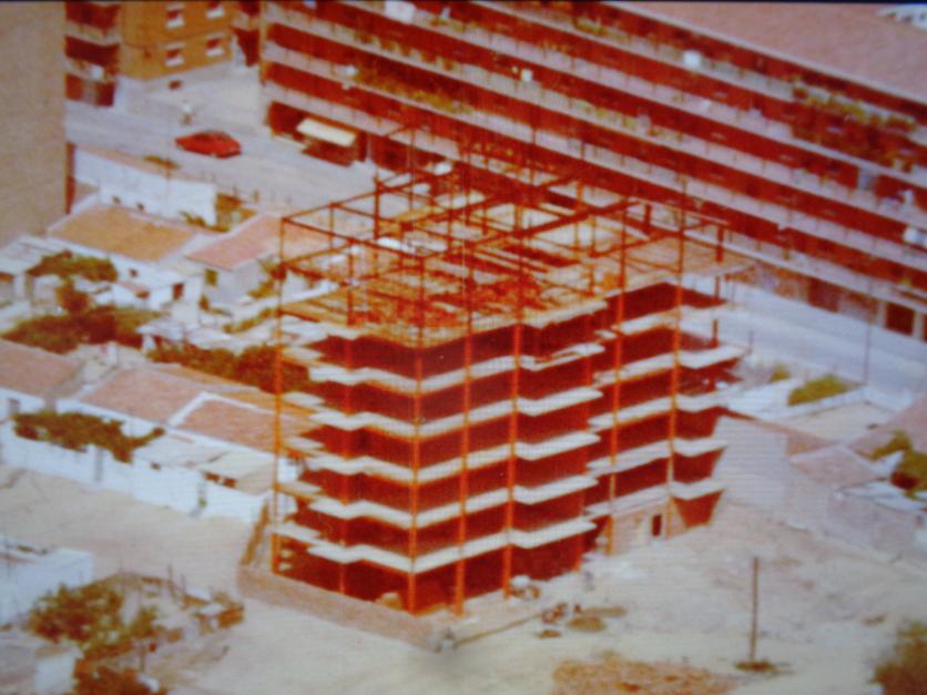 casitas baja del barrio del carmen, la zona de la avd. del carmen con calle felipe herranz junto a bloque en altura en construccion. toma aereaverano 1.973.