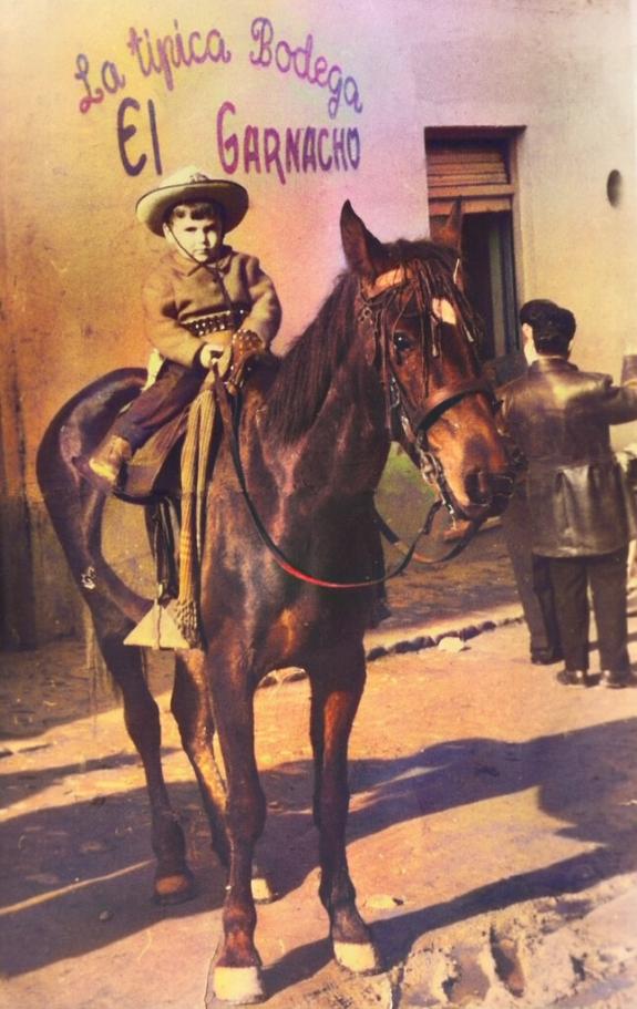 el niño florencio obispo elipe a caballo en la puerta del meson el garnacho. años 50. memoria de mad,