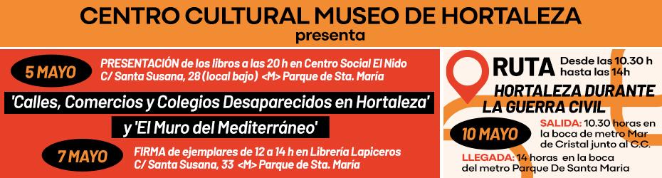 No faltes a todas las actividades de Mayo del Museo de Hortaleza. Un libro sobre el barrio, el mejor de los últimos tiempos, béllamente ilustrado a todo color y otro sobre las fortificaciones del Mediterraneo, cultura básica que enlaza con senderismo, ecología y muchos ambitos de nuestra España más desconocida. Os esperamos.