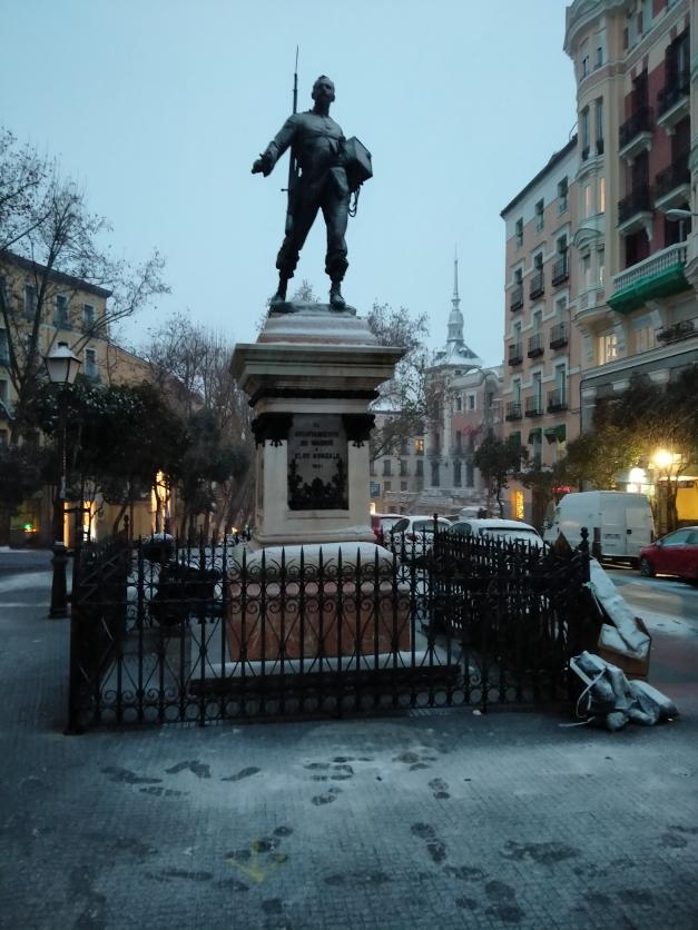 Estatua de Cascorro tras unos minutos de Filomena,