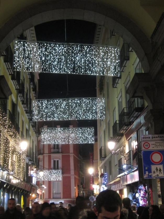 Iluminación navideña vista desde uno de los arcos de la Plaza Mayor,