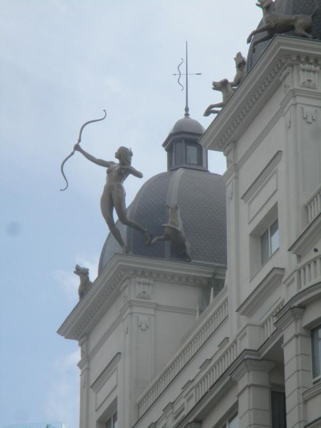 Escultura de Diana cazadora apuntando al Fénix del edificio frontal,