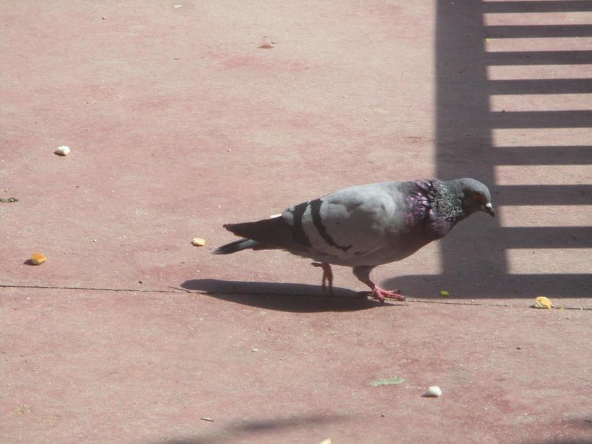 Paloma comiendo migas en el suelo,