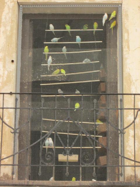 Balcón habilitado como jaula para periquitos,