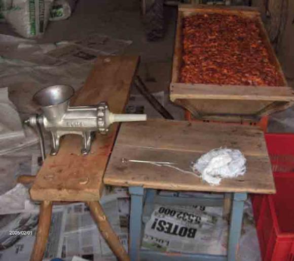 Aquí están los utensilios para enchorizar "los chicos o picadillo" en las tripas antes de ponerlos a curar en los varales: La gamella con la carne picada y adobada, la máquina de enchorizar, los hilos para atar las tripas...
