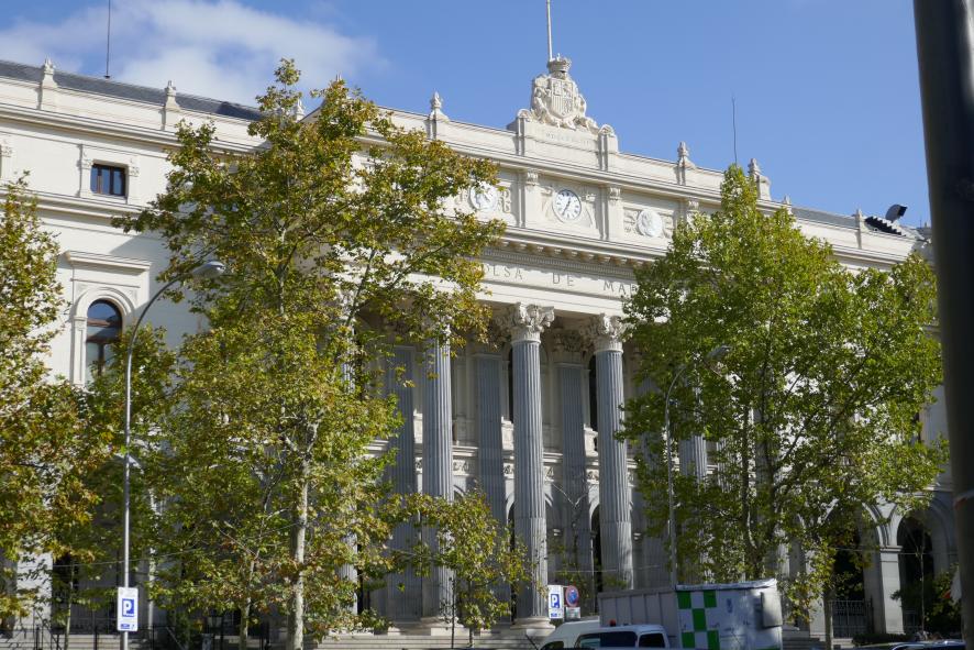 Edificio de la bolsa con escudo, reloj y columnas,