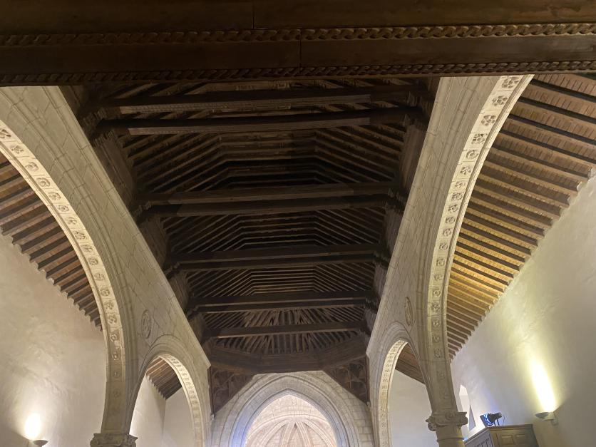 El techo está integrado por un artesonado de estilo mudéjar, hecho en madera. En el interior del cuerpo principal, se conservan dos