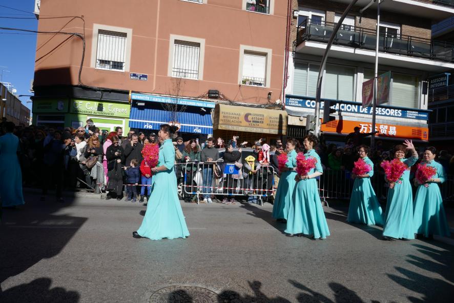 Año Nuevo Chino, damas en azul con ramo,