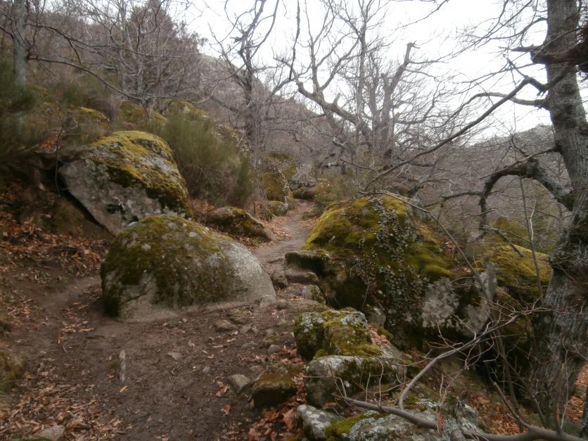 El GR-10 jalonado por rocas y árboles,