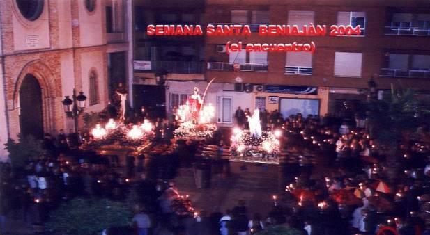 La noche de Jueves Santo, como colofón a la solemne Procesión del Silencio, tiene lugar en Beniaján el emotivo acto del Encuentro. Los tronos de la Virgen Dolorosa y San Juan Evangelista salen a la Plaza de la Iglesia para recibir al Santísimo Cristo de las Penas que, acompañado sólo por la luz de las velas de los penitentes, ha recorrido el casco antiguo a oscuras.
