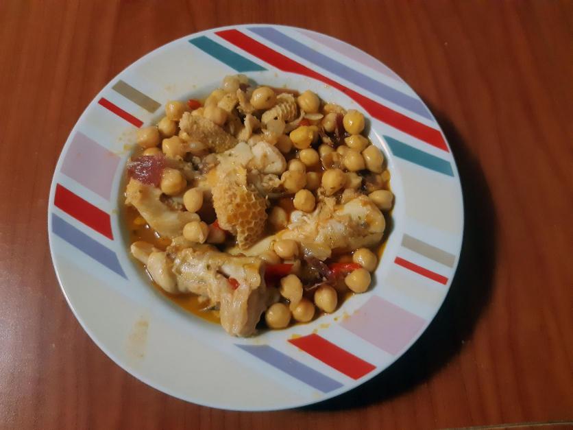 Plato español Garbanzos con manos y tripa de cordero,
