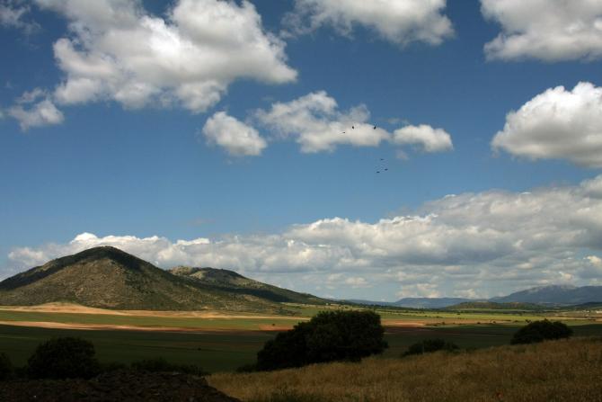 En esta foto se puede apreciar una montaña la que algun mapa aparece con el nombre de Sierra de Topares, pero los habitantes del campo de Caravaca, se le conoce como la Sierra de La Junquera, con la particularidad que en lo mas alto de la misma, existe el Mojón de las tres provincias, ya que en este punto confluyen las provincias de Murcia, Almería y Granada; mas al fondo y un poco a la derecha, se observa otra montaña, cuyo nombre, es el de La Morra de La Carrassca y por la que discurre el límite...