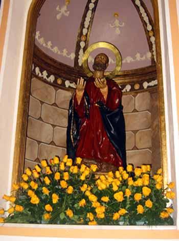 La imagen de san Pedro apostol de la parroquia de San Frnacisco de Asis en Actopan Veracruz porta una tunica blanca con como una especie de chaleco rojo en una de sus manos lleva un cetro real y en la otra las llaves que le entrego Jesus para que dejara entrar a los muertos al reino del señor y en la cabeza un sombrero con incrustaciones de piedras preciosas. Escepto las manos y cabeza, que se conservan del anterior a la guerra civil, en el cual los republicanos lo intentaron quemar, posteriormente se le hizo el cuerpo para dichos miembros. San pedro esta situado en la iglesia del perpetuo socorro de la ñora, y es patron del pueblo, se celebran las fiestas patronales de san pedro apostol.
