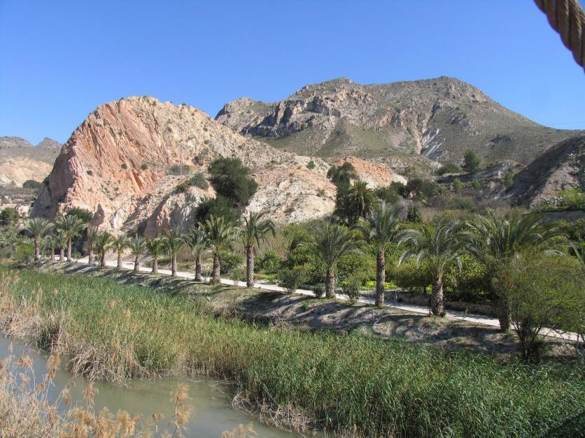 Montañas y camino con palmeras,