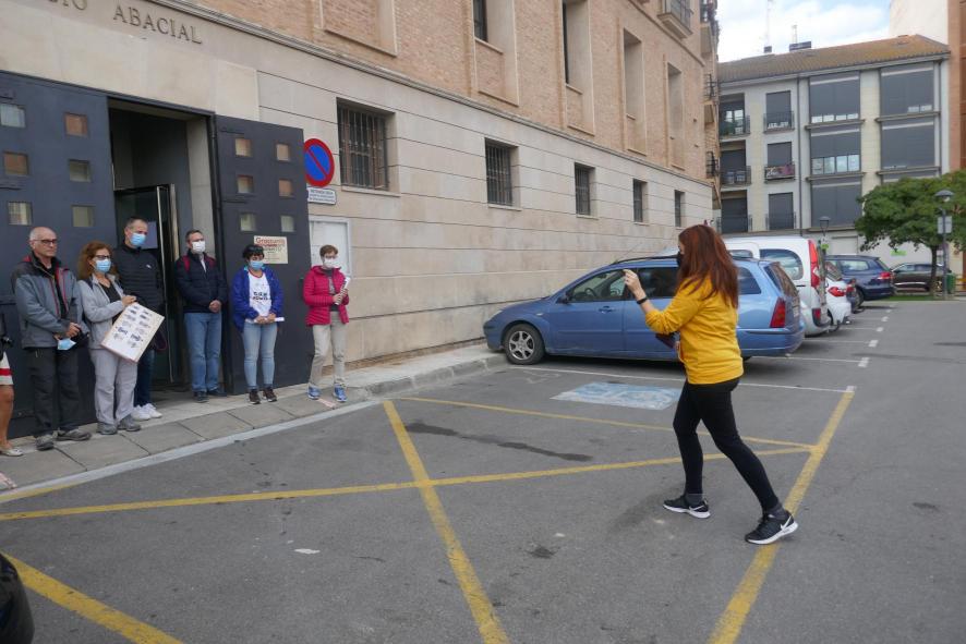 La guía del museo saca una foto al grupo,