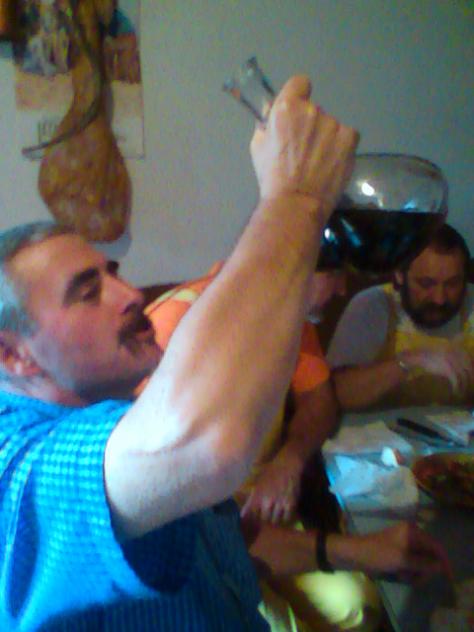 Que gozada ayer a mediodia en el bar. Entré al bar mis jóvenes amigos, Marcelo y Alfredo en la mesa con el hijo de la Tía María, Carlos y unos amigos en la barra y sin dejarme hablar, el "cenizo" de Carlos, como ami me llamaba su padre, yá me traia un vaso de vino blanco, extraordinario por cierto, con unas aceitunas. Este cariño de las gentes de Camprovín no se me olvida y al marchar sale el amigo Javi, el de la Imma, para que pruebe sus depósitos de clarete y de tinto. Al final a bajar por la M-30... Di que si amos, todo lo que este en mi mano estuyo. un abrazo Ostia, Carlos, si antes hablo del porrón antes veo una foto con el porrón al alto y el jamón de fondo. Vamos a provecharnos de estos buenos ratos que con la crisiiiiiiiiiiis, no hay más que tristezas. Un abrazo Un buen trago y con estilo