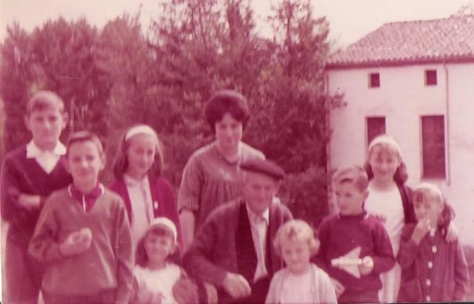 Tu abuelo Matías con su hija pequeña Carmen y con parte de sus diecisiete nietos, ¿sois tantos?, me encanta verlo porque es así cómo yo recuerdo a este hombre.