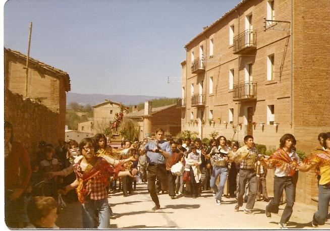 Lo de los vestuarios solamente era obligatorio el pañuelo que ni siquiera era el típico de danzar que se utiliza en otros pueblos de la Rioja, era el que traían los mozos del servicio militar en África (supongo que por la vistosidad del colorido), seguro que Juan Manuel, Vito y Pepe trajeron, a mi me suena que se le pedía a Esther porque en casa tenían uno, no se si de Arecio o de Rubén. Hola Pepe, la costumbre era ponerse el pañuelo sobre el hombro que cuando se saluda al santo quede hacia el publico, el cachiberrio como esta en el centro se lo puede poner como mas le guste, saludos pues yo en esta foto, solo reconozco a los danzadores y a bruno benes. el de la esquina de la izquierda de rojo... j. carlos diez?