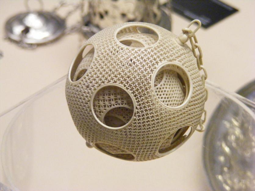 Juego de bolas concéntricas y cadena talladas en marfil,