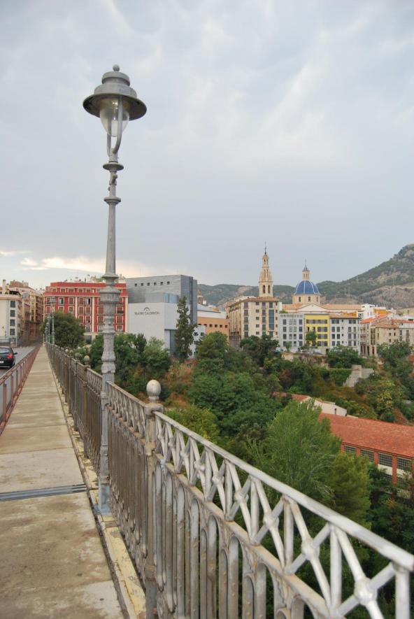 farola en el Viaducto de Canalejas. La iglesia de Santa María al fondo,