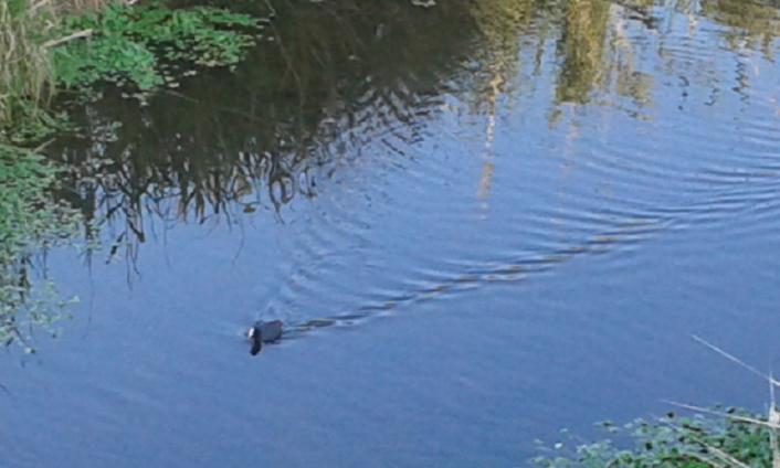 Una Focha surca las aguas del rio,