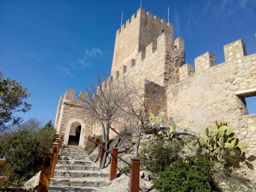 Castillo de Bañeres: El castillo de Bañeres (provincia de Alicante, España) es una fortaleza de origen almohade construida en el siglo XIII que se sitúa sobre el cerro del Águila (tossal de l'Àguila) en el centro geográfico de Bañeres, a una altura de 830 msnm. 2. Es una fortaleza de grandes dimensiones y aunque ha sido reconstruida en su totalidad, aún se aprecian restos de su primitiva construcción. Los distintos recintos nos acercan a épocas pasadas y a sus modos de vida. Consta de una planta poligonal con doble recinto amurallado en el que destaca la Torre del Homenaje, de época Almohade (s. XII – XIII) construida mediante la técnica tapial (cal, arena, agua y piedras pequeñas).