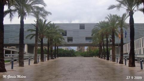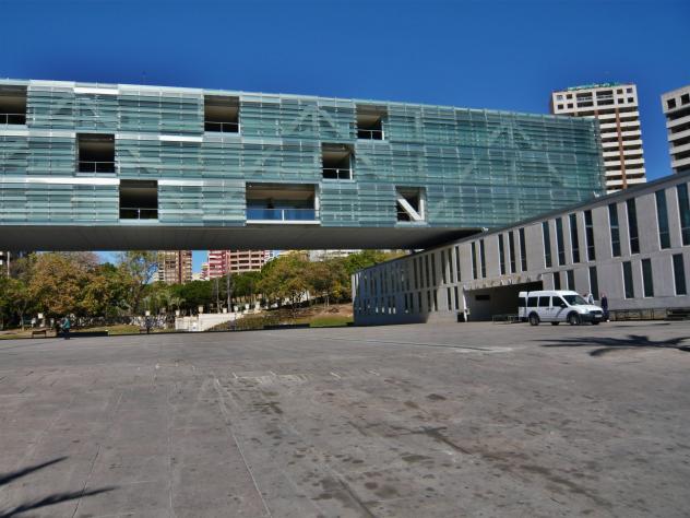 Se construye un prisma de 97.20 de longitud por 15.30 m de anchura y 12 m de alto apoyado sobre dos pares de soportes situados a 64,8 m de distancia, por tanto generando dos voladizos de 21,60 m y 10, 8 m a cada lado, y elevado una altura de 10, 80 m sobre la plaza que se sitúa encima del forjado superior del aparcamiento publico subterráneo que se mantuvo en funcionamiento durante la ejecución de las obras. Perpendicular a este prisma y por debajo del mismo nacen del subsuelo los bloques de hormigón antes citados relacionándose con el primero a través de los elementos de comunicación vertical y los espacios de instalaciones.