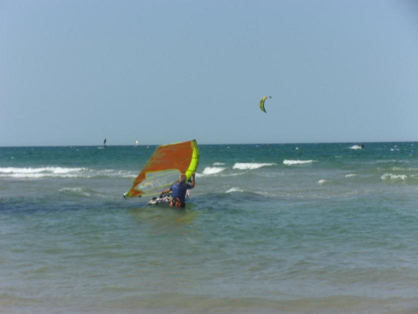 Windsurfista adentrándose en las aguas de la playa para navegar,