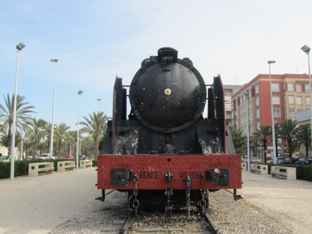 Locomotora de vapor fuelizada de Renfe tipo "Mikado" 141F 2351 Tras su estancia en el depósito de Madrid-Atocha hasta mediados de los sesenta, pasó a continuación al de Ciudad Real siendo cedida posteriormente al Regimiento de Zapadores Ferroviarios. Finalmente quedó instalada en la Avenida del Ferrocarril de Elche.