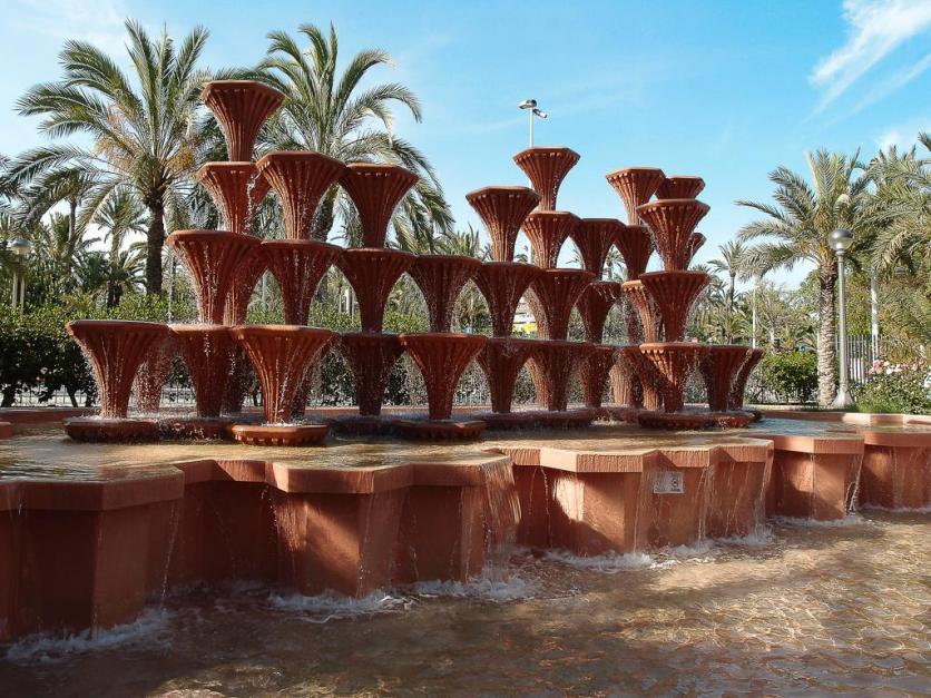 Fuente y palmeras,