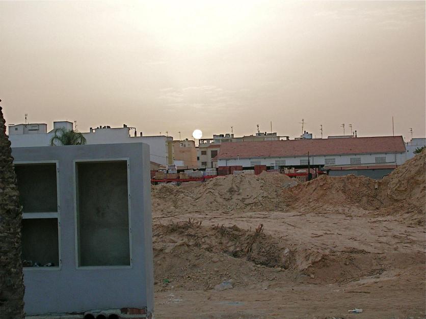 Disco del Sol encima de viviendas,