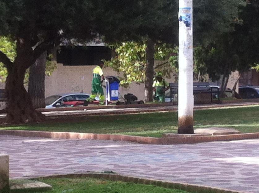 Operarios segando césped,