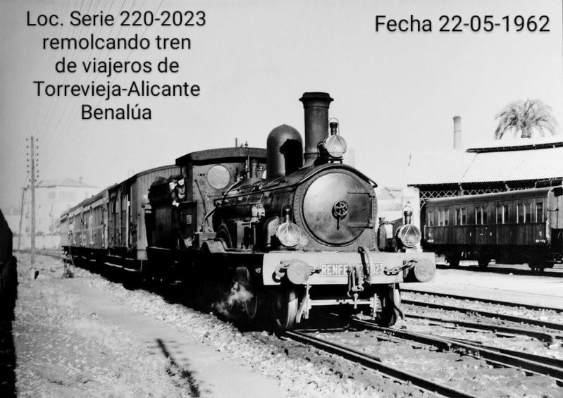 Alicante Benalúa, en fecha 22 de mayo de 1962, remolcado por locomotora de la serie 220-2023, estas locomotoras procedían de la antigua compañía de ferrocarriles Andaluces, pasando a Renfe con la