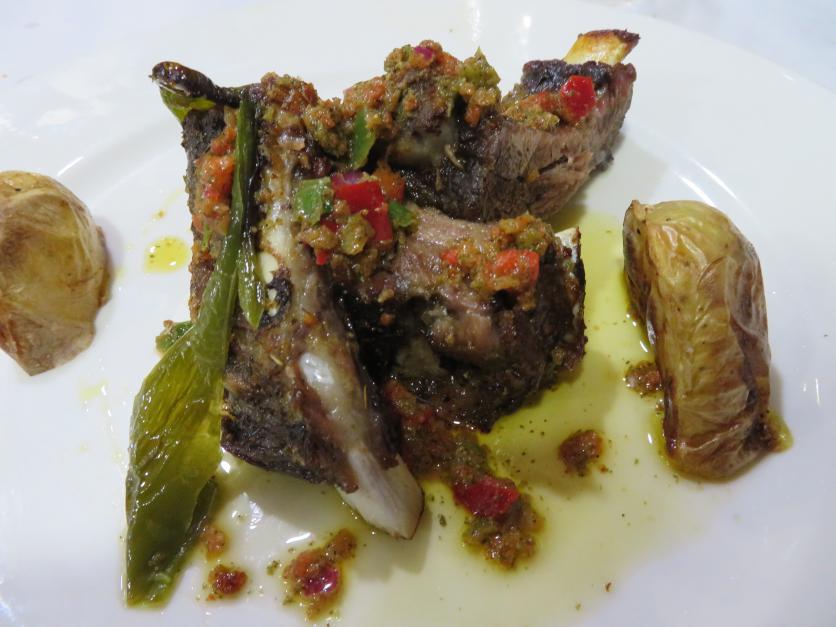 Costilla al horno, adobada con una salsa vinagreta con cebolla y pimiento rojo,