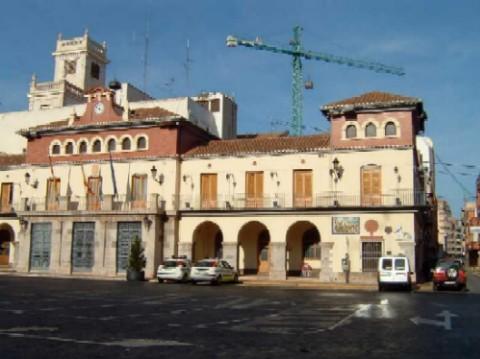 Y delante del reten lso dos coches de la Policia Local, suelen pasarse la noche alli aparcaditos, se ve que tienen mucho trabajo en el reten, asi que el pueblo esta muchas veces sin vigilancia. A mi madre que fue criada en Vall de Uxó me gustaria enseñarle algunas fotos muy agradecida,C,M. Imagen del Ayuntamiento desde los pies del campanario. Por detrás se ve la torre del edificio de la Caja Rural San José de Nules.