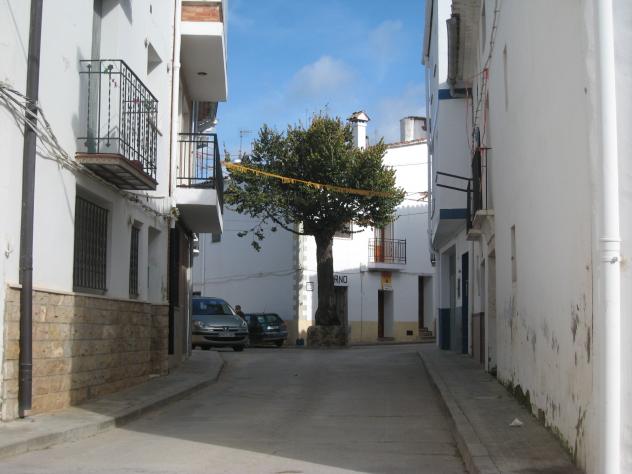 Calle con árbol de protección en la esquina,