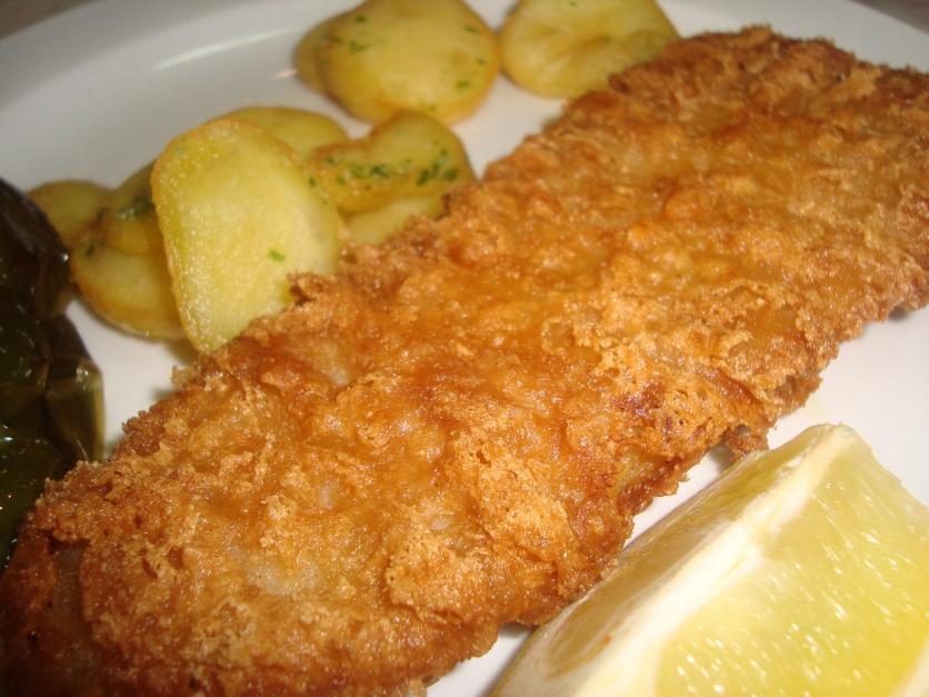 Plato de pescado rebozado con patatas,