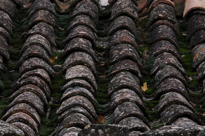 Tejas moriscas y canales con musgo por humedad,
