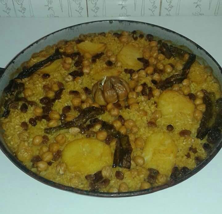 con garbanzos i "panses" (Plat típic de Benifairó de la Valldigna, Arròs al forn amb sigrons i panses)