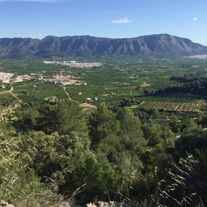 (Vista del Reial Monestir de Santa María de la Valldigna, situat a la localitat de Simat de la Valldigna) al fondo