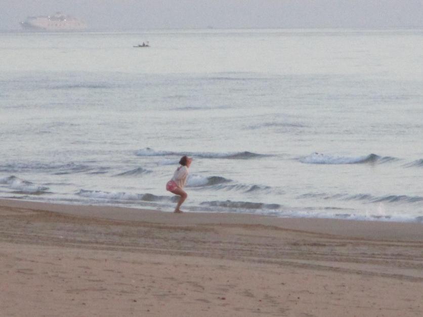 Salutación al sol en la playa,